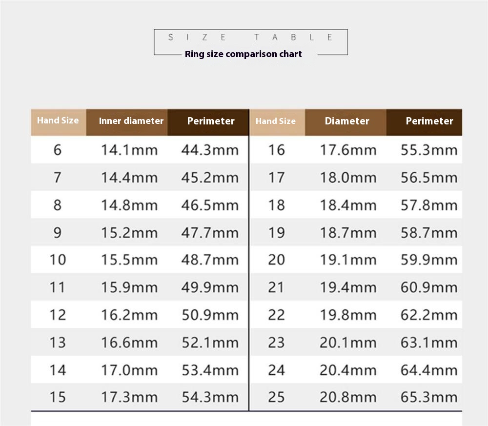 Ring size: no.13 (US Code 6#), no.15 (US Code 7#), no.18 (US Code 8#), no.20 (US Code 9#), no. 22 (US Code 10#)
